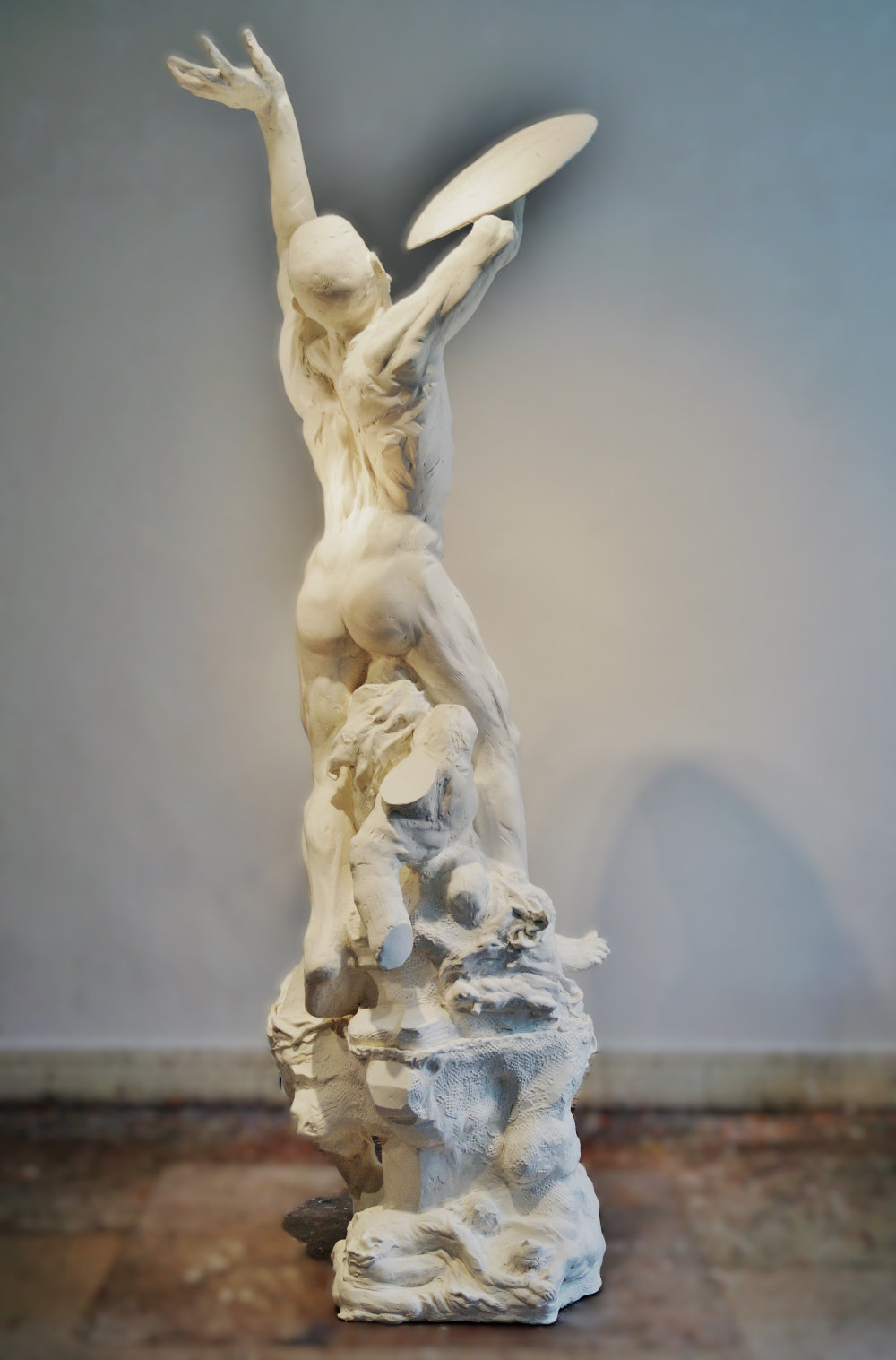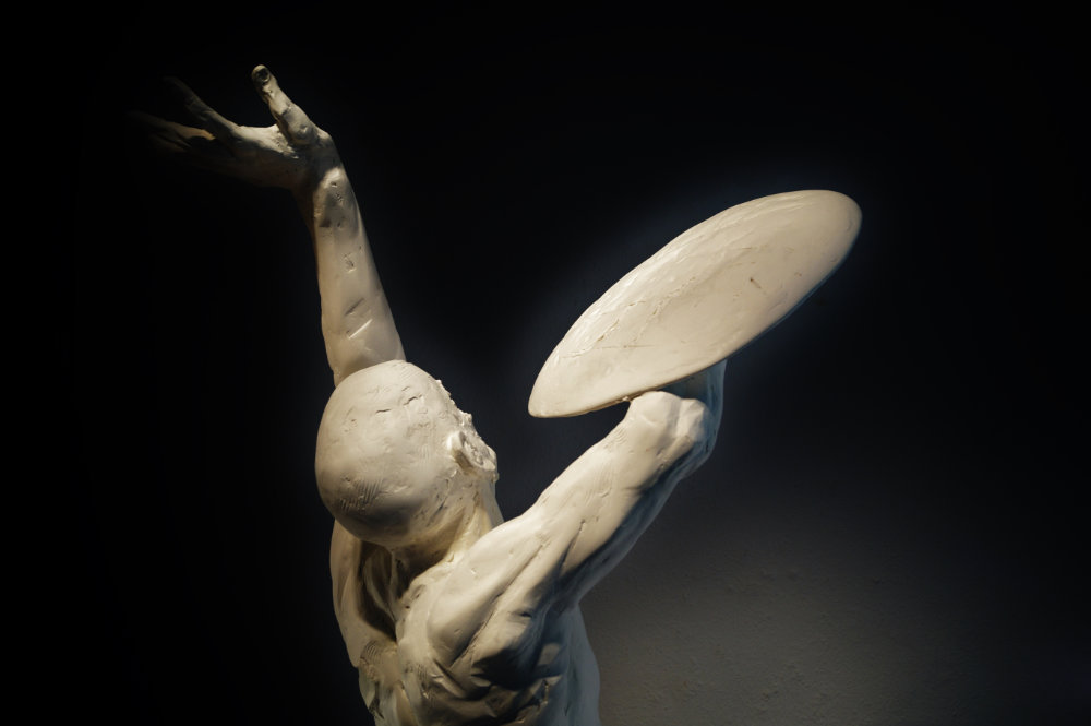 “Since the evolvement of mankind humans have pondered what would be out there in the heavenly skies, which inspired artistic expressions in many cultures, being either God, Gods or eternal natural forces, the Eternal Law of nature. The concepts range from pure love, often mixed with awe and fear, and are inspired into notions of beauty and the sublime. Somebody Out There carries no weapon and is no warrior, but still has a shield. The sculpture offers many incentives for the viewer’s own narrative and emotions.”