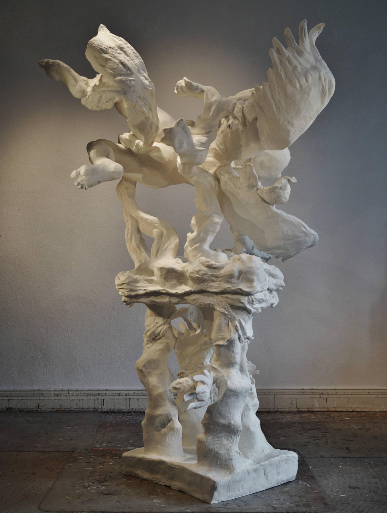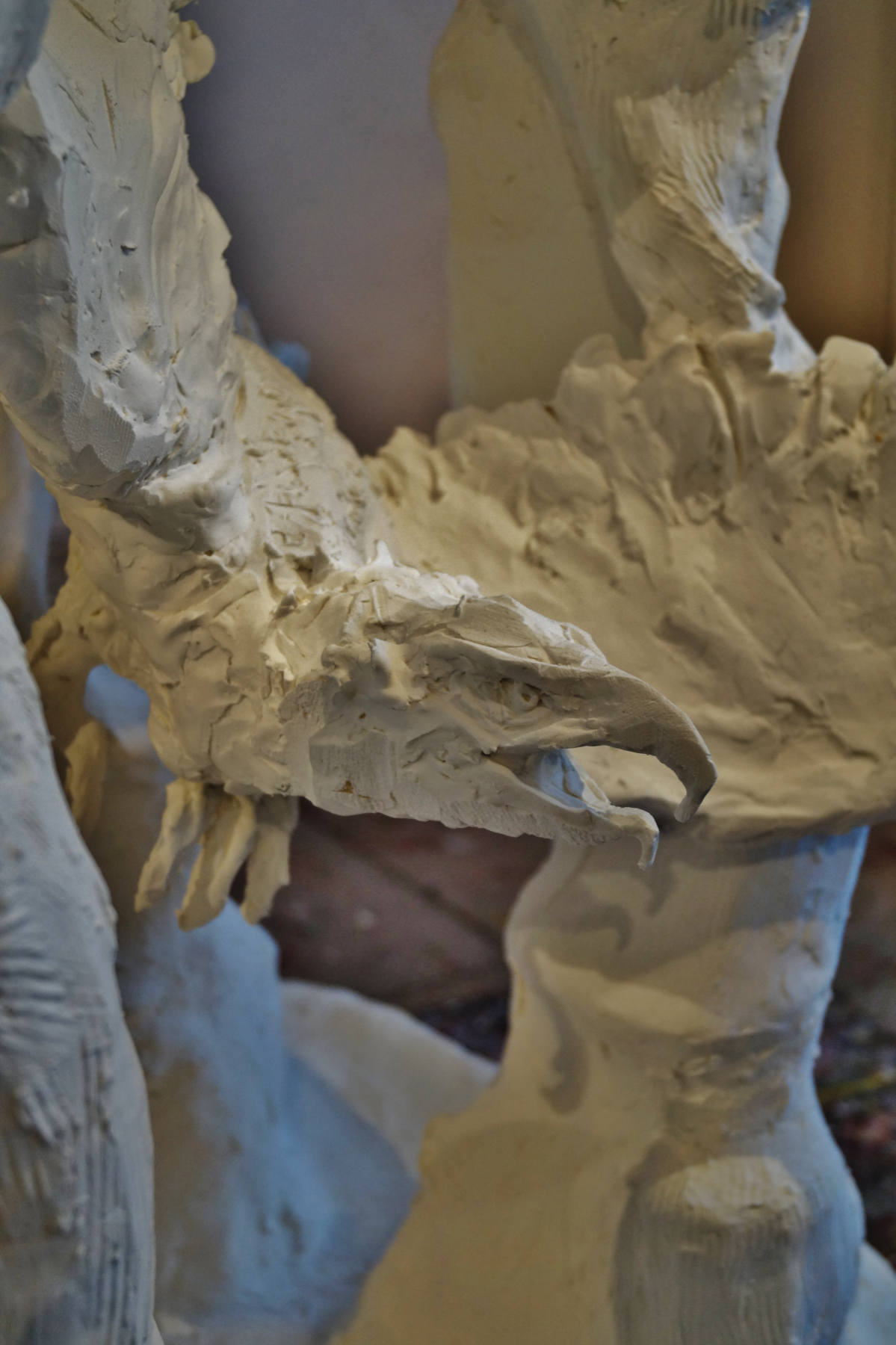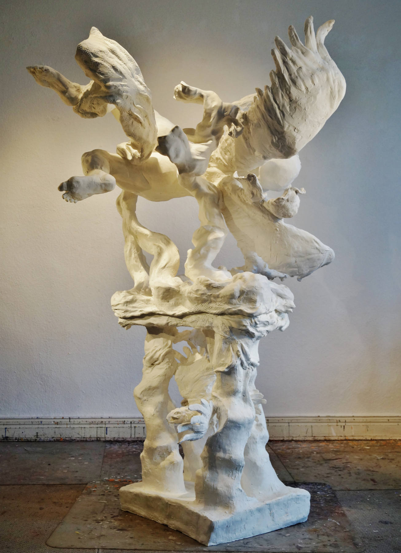 “Concepts of communication between humans and the above, or beyond, have been explored since ancient time, as the smoke of sacrifices curling into the heavens, or winged messengers from God or the Gods. Winged phantasy animals or humans evolved in Persia, India, China, other Asian and American cultures, leading to the idea of benign angels (as well as devils) in various religions. Soaring Calm and Free offers an open-ended reference to this long tradition. Is this a messenger of God or the Gods, a falling angel, an Icarus whose unlimited ambition made him fly too high, or does this sculpture personalize a freewheeling on the winds of life?”