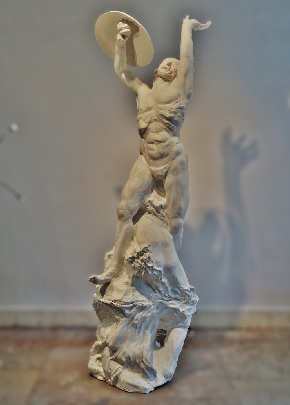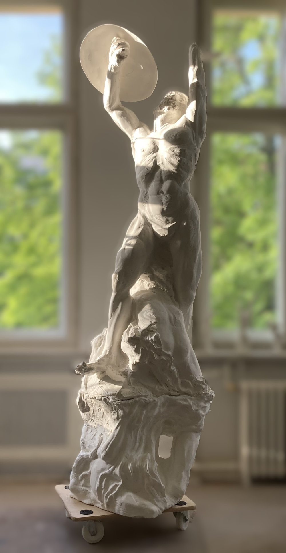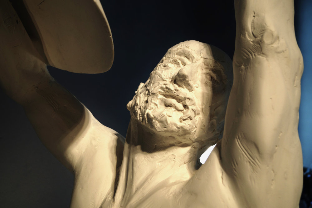 “Since the evolvement of mankind humans have pondered what would be out there in the heavenly skies, which inspired artistic expressions in many cultures, being either God, Gods or eternal natural forces, the Eternal Law of nature. The concepts range from pure love, often mixed with awe and fear, and are inspired into notions of beauty and the sublime. Somebody Out There carries no weapon and is no warrior, but still has a shield. The sculpture offers many incentives for the viewer’s own narrative and emotions.”